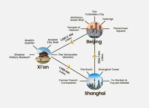 Let’s consider the distances between Beijing, Shanghai, and Xi’an. This will give you an idea of the best way to travel around!