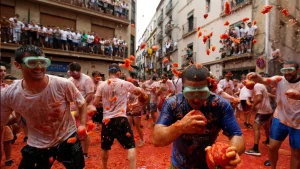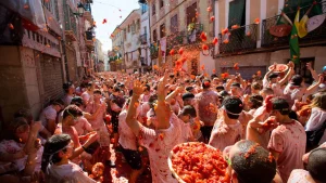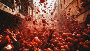 At 12 sharp, a cannon fires and trucks dump tons of tomatoes into the streets. People grab tomatoes and throw them at everyone. In minutes, the streets turn red and everyone gets soaked in tomato juice. It’s wild, funny, and full of laughter! The tomato fight only lasts for an hour.