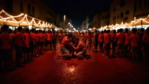 The tomatoes are soft, so it’s safe and playful. After just a few minutes, everyone is covered in red! The streets turn into a river of tomato juice, and the atmosphere is full of joy and energy.