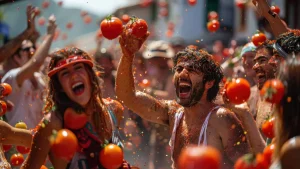 La Tomatina is a fun and exciting festival in Spain where people throw tomatoes at each other. It happens in the streets, and everyone joins in for a huge food fight. People laugh, dance, and enjoy getting messy with tomato juice all over them.